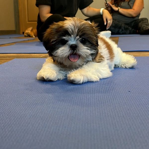 Puppy yoga is an excellent form of puppy therapy that helps young pups acclimate to new people, sights, sounds, and environments in a calm and positive setting. This form of puppy care supports their development, builds confidence, and prepares them to become well-adjusted, friendly adult dogs.
